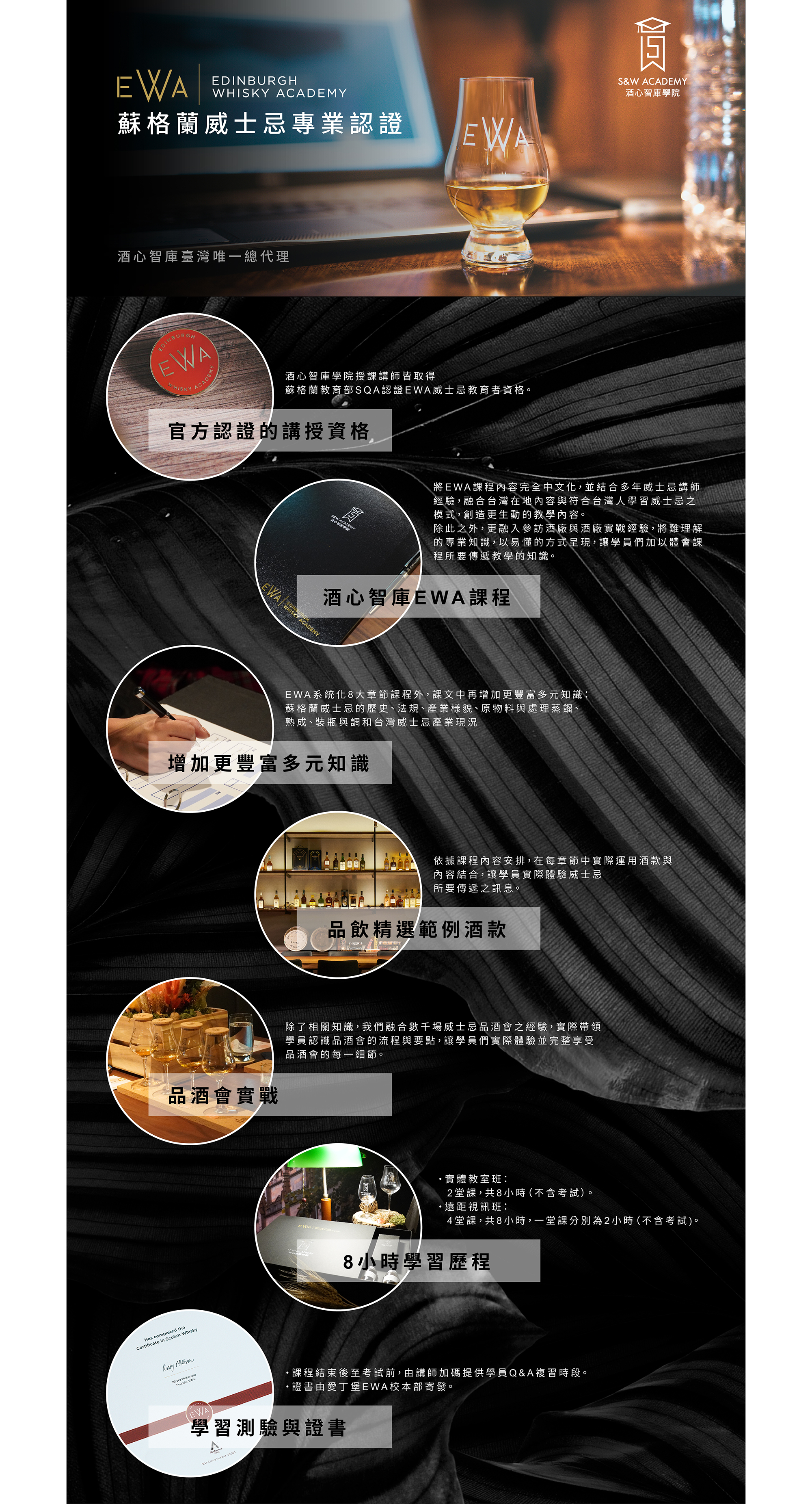 酒心智庫推出愛丁堡威士忌學院威士忌課程,其中包含威士忌專業八大章節:如歷史法規等,另結合酒廠實境與其他結合台灣市場之課程內容,帶來更深化的互動學習體驗。